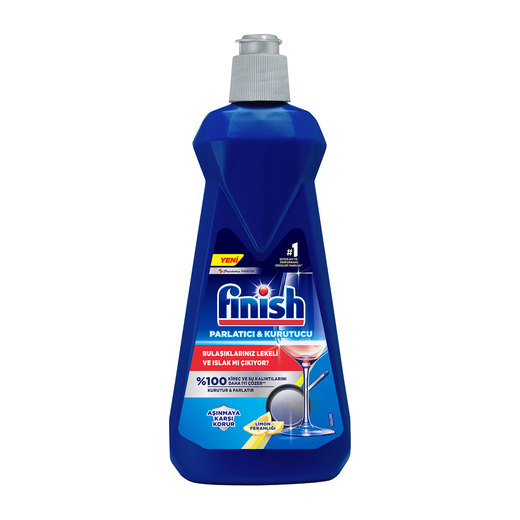Finish parlatıcı, yeni ve geliştirilmiş formulüyle bardak ve tabaklarınızı hem parlatır hem de kurutur, su lekelerinin oluşumunu engeller.Üstelik limon ferahlığı sağlar.Lekesiz bir pırlanta ışıltısı için Finish özeltuz ile birlikte kullanınız.