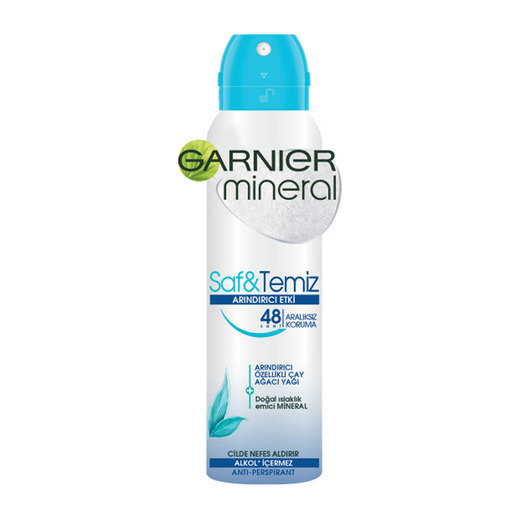 Garnier Mineral Saf&Temiz sprey, arındırıcı özellikli çay ağacı yağı içeriği ile, ter kokusuna karşı kaynağında etki ederek banyonun verdiği temizlik ve ferahlık hissini uzatan ilk 48 saat etkili anti-perspirant sprey deodorant.