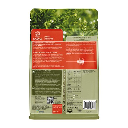 Her pakette aynı hasatın mahsulünü içerir, bu sayede eşit ve aynı sürede pişer. Parlak zümrüt yeşili renge ve pişerken dağılmayan dolgun tanelere sahip Hasata Yozgat Sultani Yeşil Mercimek aynı zamanda potasyum, protein, magnezyum, fosfor ve lif kaynağıdır.