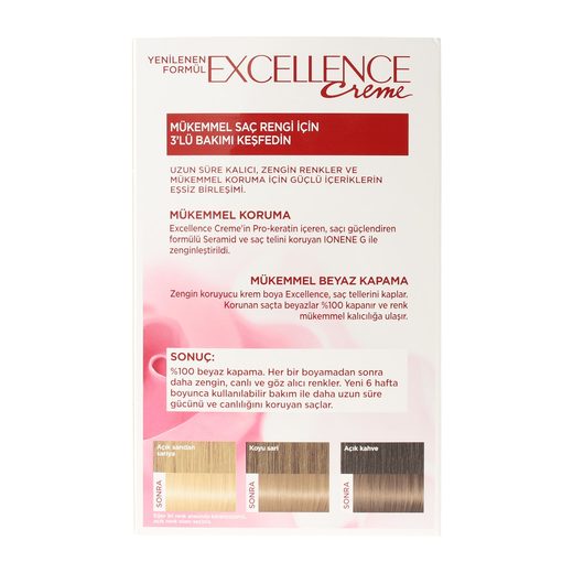 Bir saç boyasından sadece renk değil, daha fazlasını isteyenlerin tercihi,L'Oreal Paris'ten yeni Excellence. Yenilenen içeriğiyle saçınıza zengin renkler verirken, 3 aşamalı komple bakım sunar.Boyama öncesi seramid'le korur. Boyama sonrası kolajen'le yeniler.Boyama sırası pro-keratin'le güçlendirir.