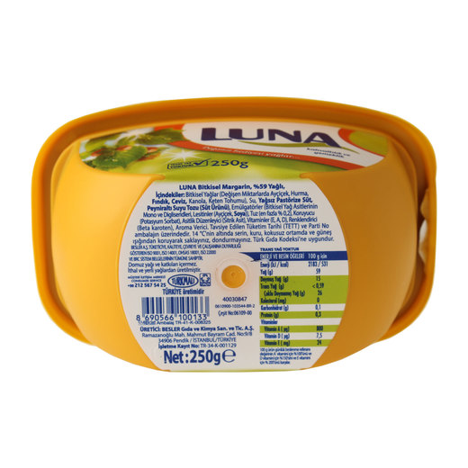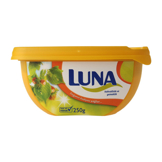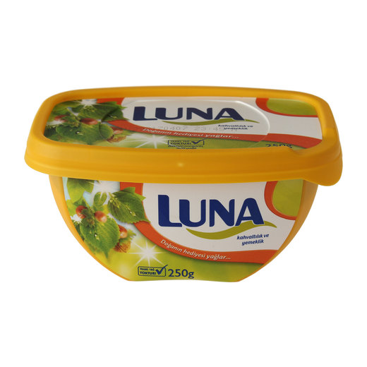 Luna kase margarin kolay sürülebilen yumuşak kıvamı ile kahvaltılarınızı tatlandıracak bir üründür.Kolesterol içermeyen bu ürün %100 bitkisel yağlardan üretilmiştir.Kahvaltılarda kullanabileceğiniz gibi,kızartma harici her türlü sıcak yemeğin yapımında da kullanabilirsiniz.