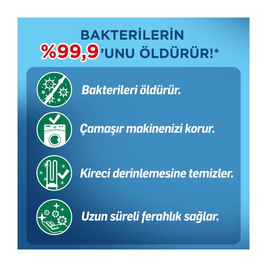 Bakterilerin %99,9unu öldürür.Kötü kokuya sebep olan bakterileri öldürerek, kötü kokuları kaynağında yok eder. Kireci derinlemesine temizler.Gizlenmiş kir ve kalıntıları yok eder.Makineninizin deterjan gözüne 1 şişeyi boşaltın ve ve makinenin içerisinde çamaşır yokken 50 derecede çalıştırın.Antibakteriyel etki için 2 ayda 1 kullanın.