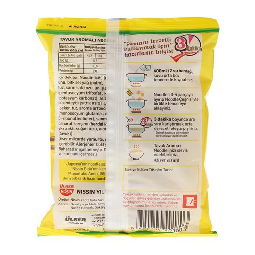 Ülker nissin tavuk noodle,sıcak su ile sadece 3 dakika içerisinde servise hazır hale geliyor.