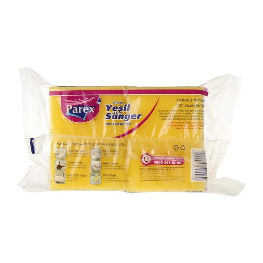 Parex yeşil sünger,dayanıklı dokusu ile zor kirleri ve lekeli yüzeyleri çabucak ovar ve temizler. Tüm sert yüzeylerde mükemmel sonuç sağlar.Başlıca kullanım alanları,çelik tencere, tava, ızgara ve ocak üstü, farklı sert yüzeyler.