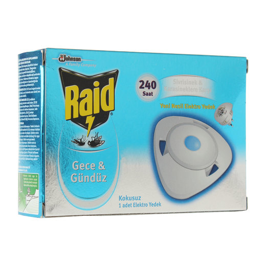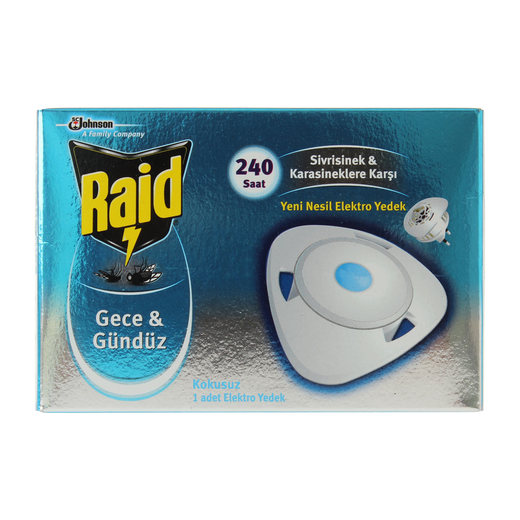 Raid gece & gündüz, bir adet elektro ısıtıcının sıkıştırılmış kum içeren özel yedek ünitesi ile birleşmesinden oluşur. Bu özel yedek ünite, karasinek ve sivrisineklere karşı etkili bir formül içerir.Ayrıca, yedek ünitesi etken maddeye dokunmanızı engelleyecek şekilde plastikle kaplanmıştır.