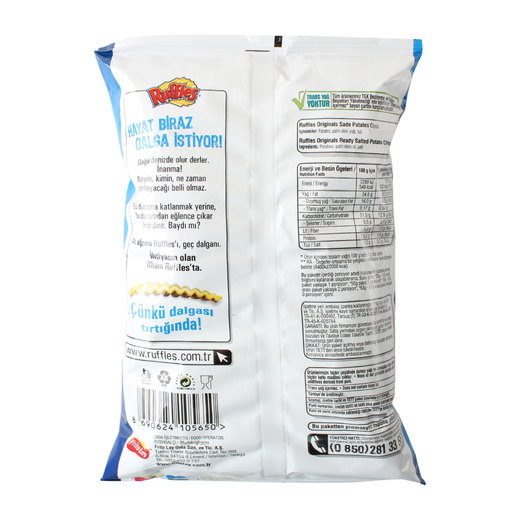 Frito Lay tarafından üretilen Ruffles cipsleri Türkiye'nin özenle seçilmiş patateslerini bir araya getirir. Adı sade, lezzeti efsane! Acıktığın anlarda Ruffles Originals’tan başkasını arama! Aç bir Ruffles, dalgana bak!
