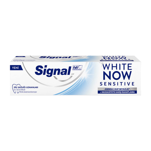 Özel bileşenleri sayesinde ilk kullanımdan itibaren dişlerde 3 kata kadar beyazlatma etkisi gösteren Signal White Now Sensitive kahve, nikotin, çay gibi maddelerin etkisiyle oluşan yüzey lekelerini giderir.
