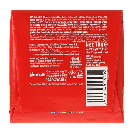 Ülker sütlü çikolata,yumuşacık,ağızda eriyen yapısı ile lezzetli bir çikolatadır. Benzersiz tadıyla,büyük küçük herkesin severek yediği atıştırmalıktır.