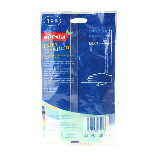 Vileda extra sensation eldiven hassas görevler için tasarlanmıştır. Ekstra ince lateks sayesinde maksimum hassasiyet ve kontrol sağlar. Süper esnek ve su geçirmez dış yüzeyi sayesinde eli ikinci bir deri gibi sarar, cildi dış etkenlerden korur.